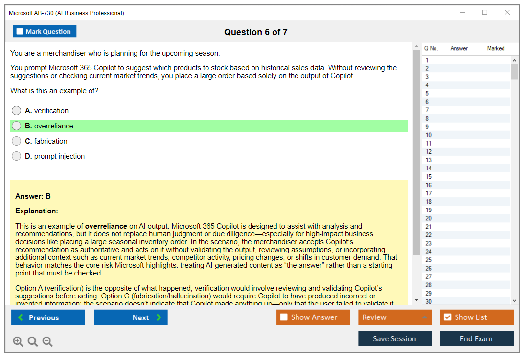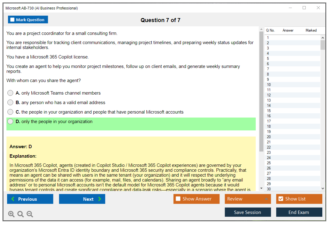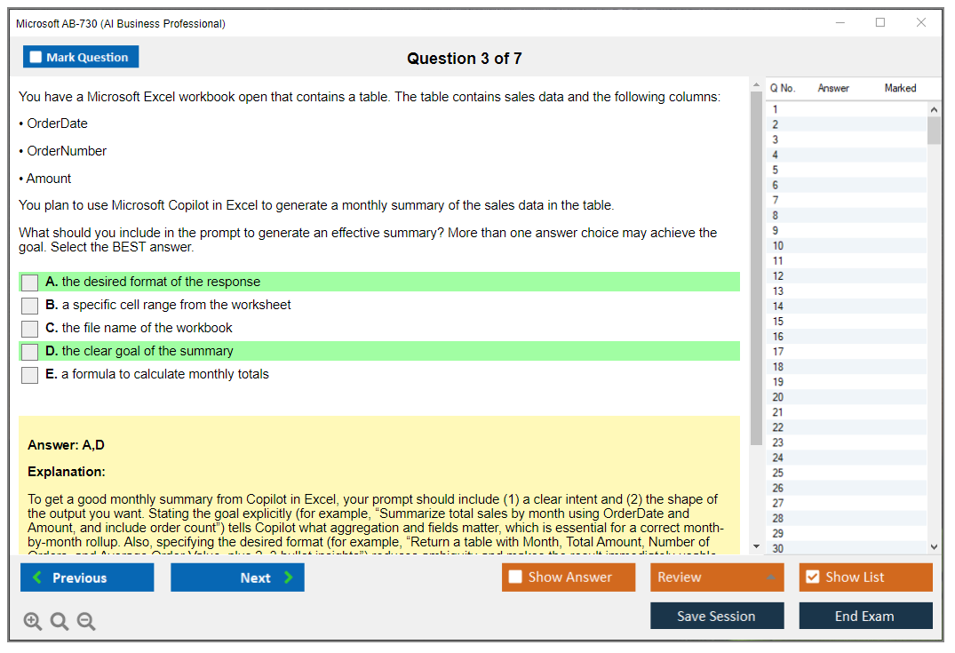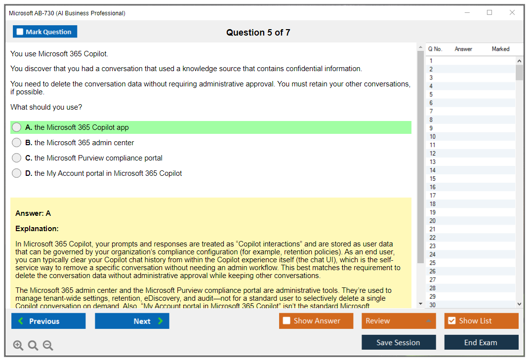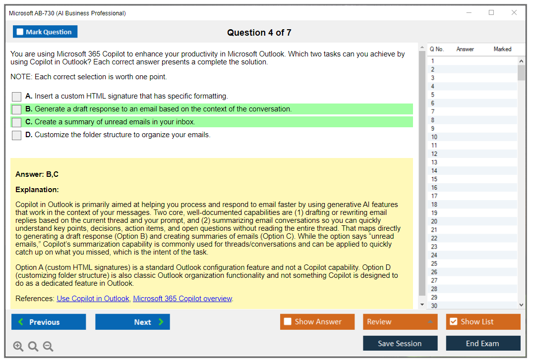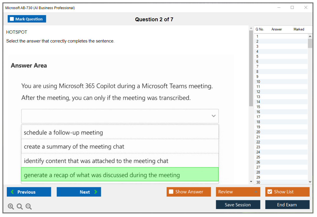 Our AB-730 Testing Engine will Save your AB-730 Exam Score so you can Review it later to improve your results.