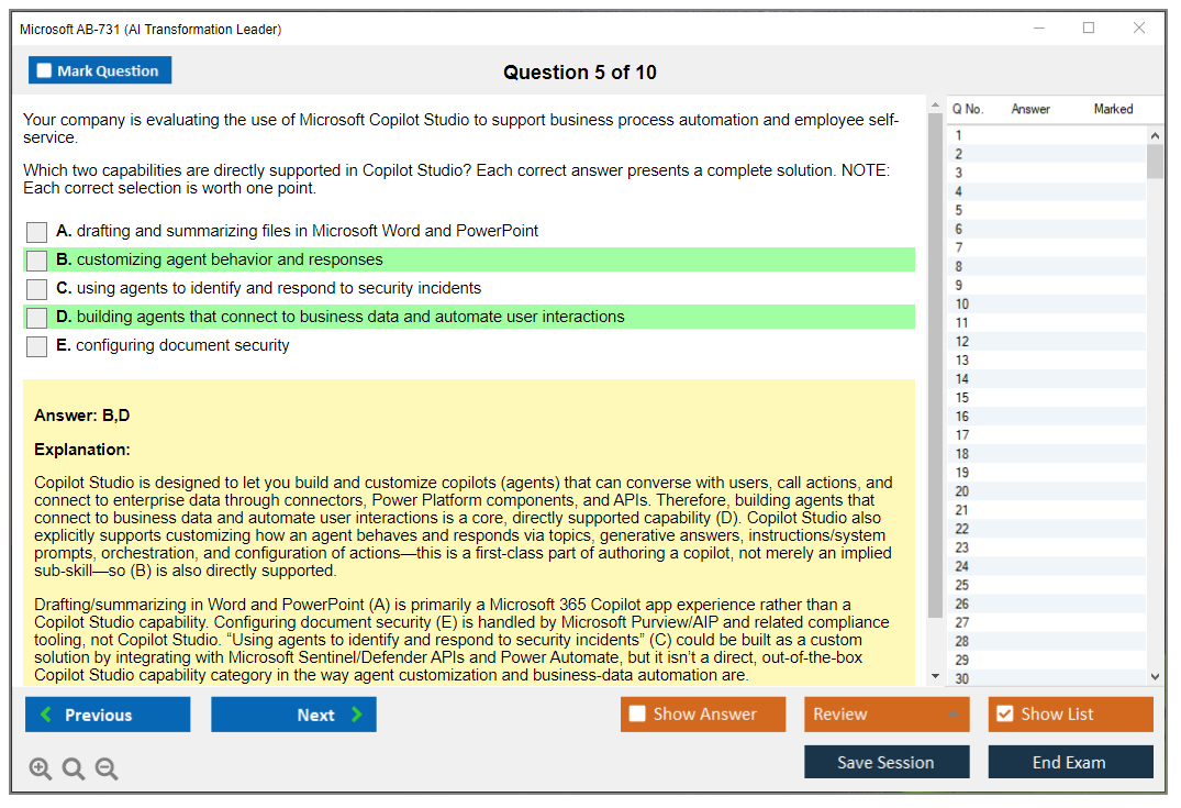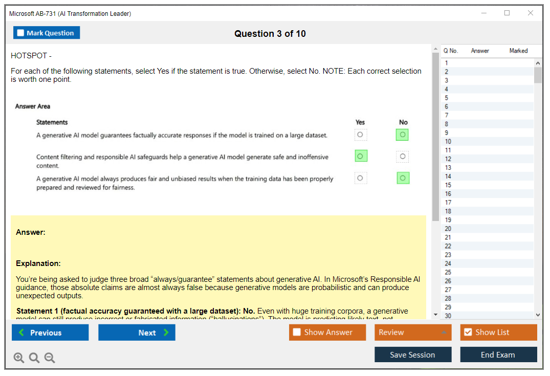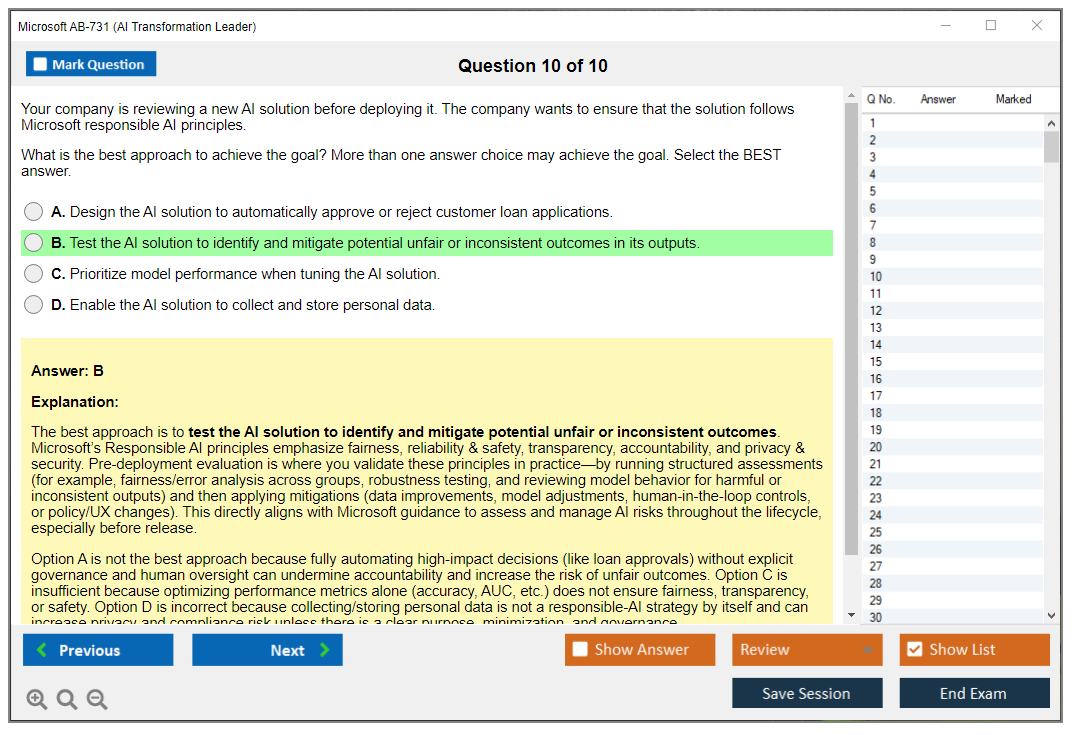 Our AB-731 Testing Engine will Save your AB-731 Exam Score so you can Review it later to improve your results.