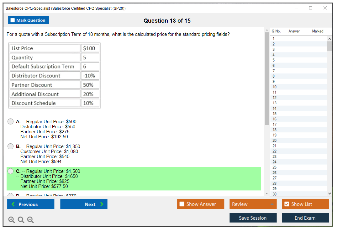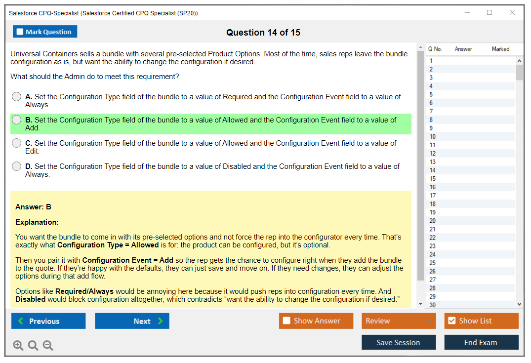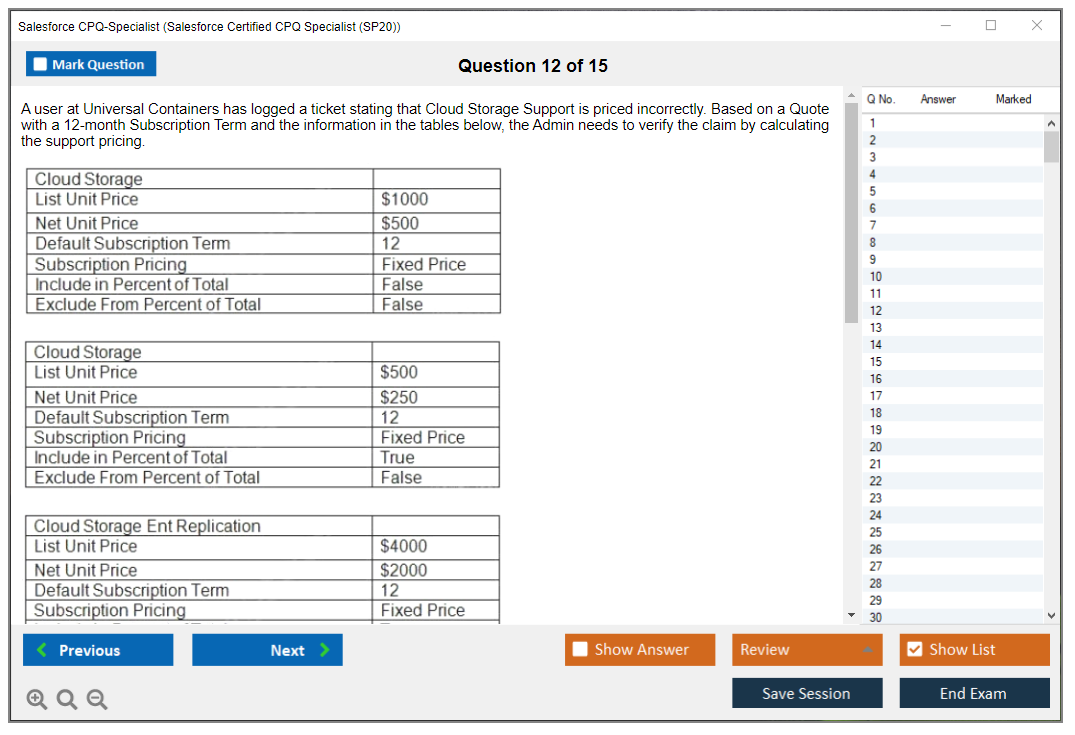 Our CPQ-Specialist Testing Engine will Save your CPQ-Specialist Exam Score so you can Review it later to improve your results.